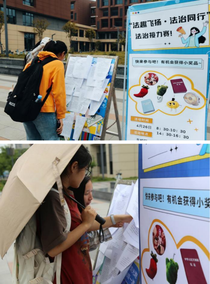 为深化大学生法治素养培育,2025年4月27日,yl6809永利官网在东校区16教和西区体育馆前同步开展“法趣飞扬,法治同行”法治接力赛。活动现场吸引了全校众多师生参与,营造了“以赛促学、以学促练”的校园法治文化氛围。