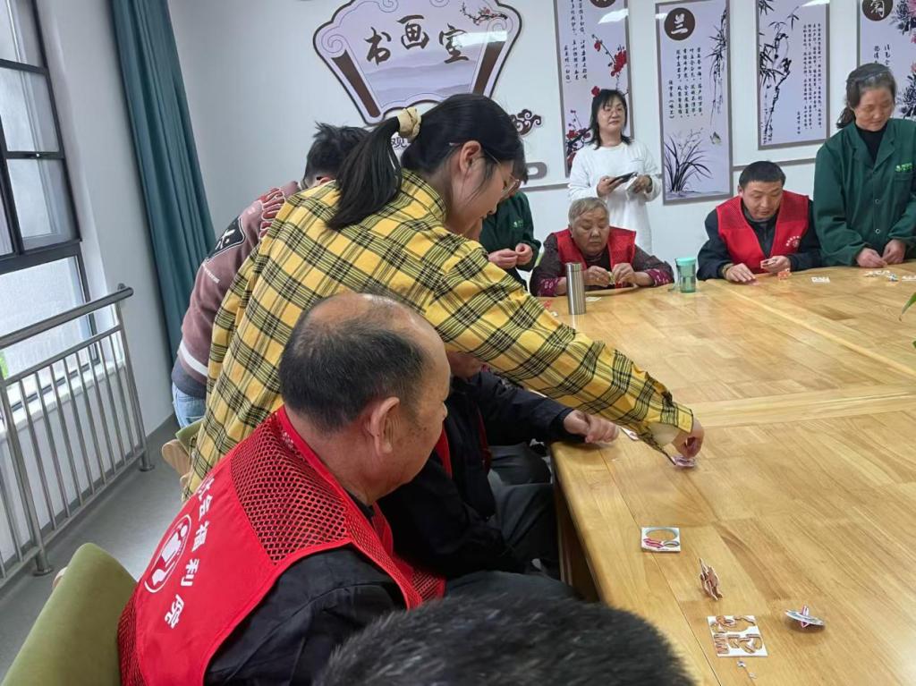 活动伊始,志愿者们带领老人们在大厅做起了十五分钟健身操,伴随着轻快的音乐,老人们舒展筋骨,脸上洋溢着笑容。随后移步书法室,志愿者们手把手教老人们折纸陀螺,彩纸翻飞间,欢声笑语不断。