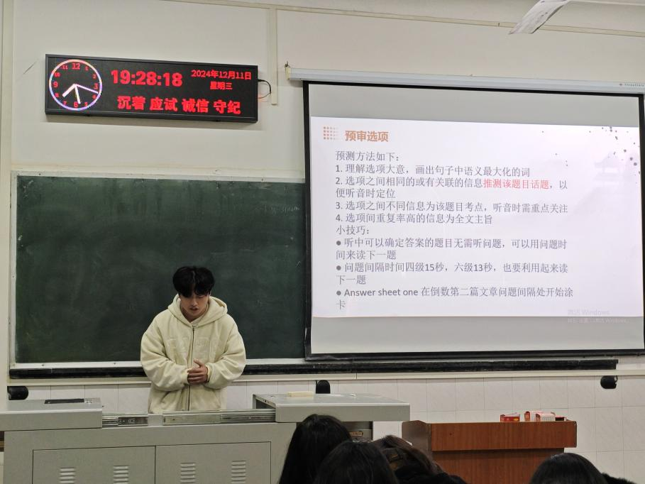 紧接着,曾祥上台为大家带来了精彩的分享。他详细剖析了四级考试各个题型的特点与解题策略,特别是在听力部分,他强调了预审、勾画、联想等做题技巧的重要性,并分享了在听力练习中遇到未听清、难听清情况时的补救措施。在阅读方面,曾祥讲述了如何快速定位关键信息的技巧,帮助同学们提高阅读速度和准确率。而在写作与翻译部分,他更是精心准备了句式模板和高级词汇汇编,为学弟学妹们的考前冲刺提供了有力的支持。此外,曾祥还分享了自己的备考时间规划与心态调整方法,提醒同学们要合理安排学习时间,避免考前焦虑,保持良好的心态面对考试。