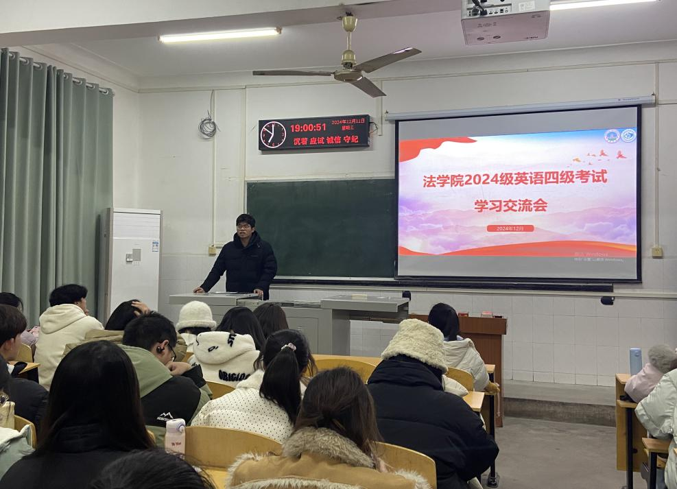 (通讯员:李玉豪/文 向若涵/图)为了全力支持yl6809永利官网2024级学生在即将到来的英语四级考试中取得佳绩,12月11日晚,一场以“经验分享,决战四级”为主题的英语四级考试交流会在西校区二教306室举行。此次交流会由23级曾祥学长与柯淼学姐主讲,李玉豪同学主持,高英班全体同学参加。