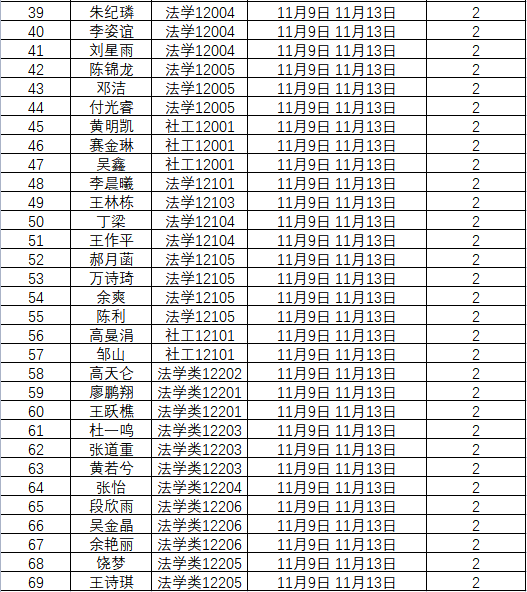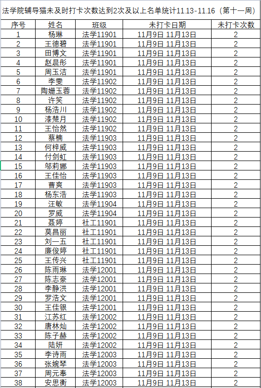 根据学校要求,2022年11月7日——11月13日(第十一周)组织全体本科生进行每日“辅导猫”打卡。经分管辅导员、学工助理、班干部多次提醒,仍有69名同学未在规定时间内完成打卡,具体未打卡次数及日期如下:(表格显示)