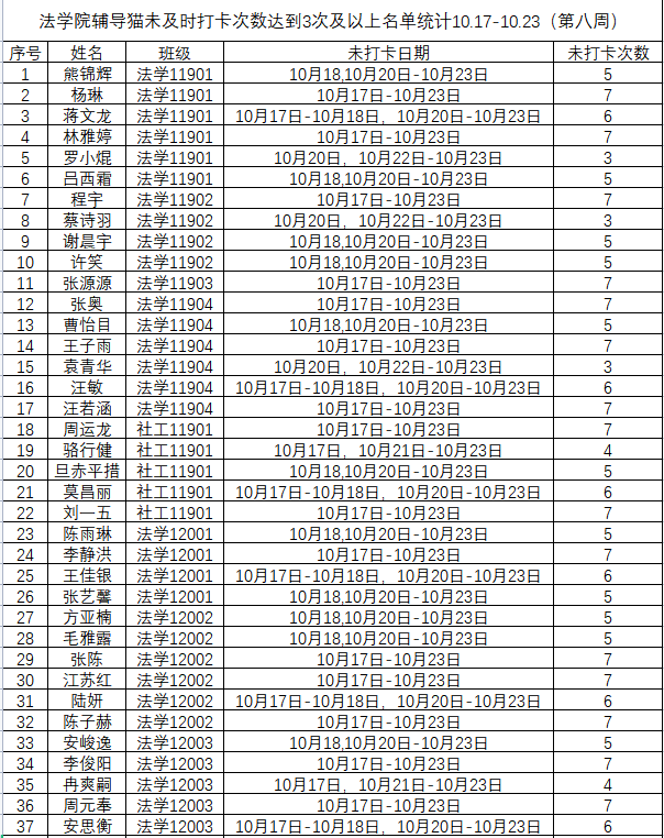 根据学校要求,2022年10月17日——10月23日(第七周)组织全体本科生进行每日“辅导猫”打卡。经分管辅导员、学工助理、班干部多次提醒,仍有68名同学未在规定时间内完成打卡,具体未打卡次数及日期如下:(表格显示)