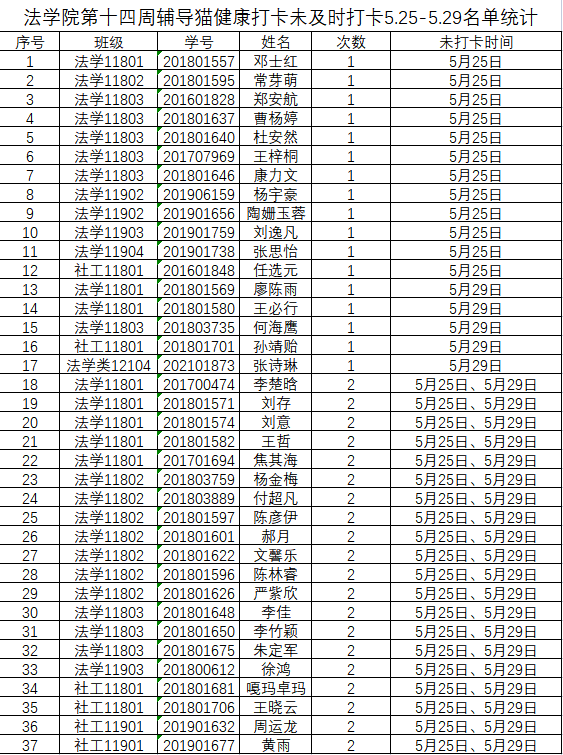 根据学校要求,2022年5月25日、5月29日(第十四周)组织全体本科生进行每日“辅导猫”打卡。经分管辅导员、学工助理、班干部多次提醒,仍有37名同学未在规定时间内完成打卡,具体未打卡次数及日期如下:(表格显示)