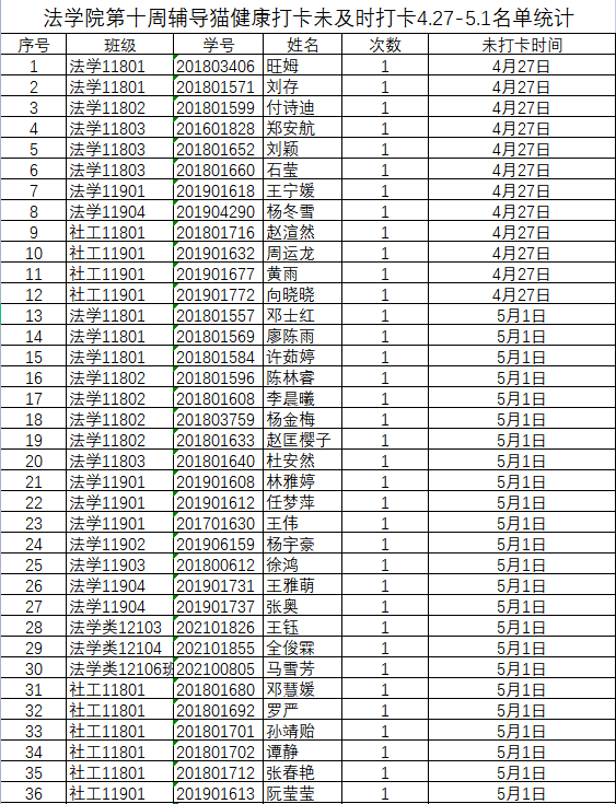 根据学校要求,2022年4月27日、5月1日(第十周)组织全体本科生进行每日“辅导猫”打卡。经分管辅导员、学工助理、班干部多次提醒,仍有49名同学未在规定时间内完成打卡,具体未打卡次数及日期如下:(表格显示)