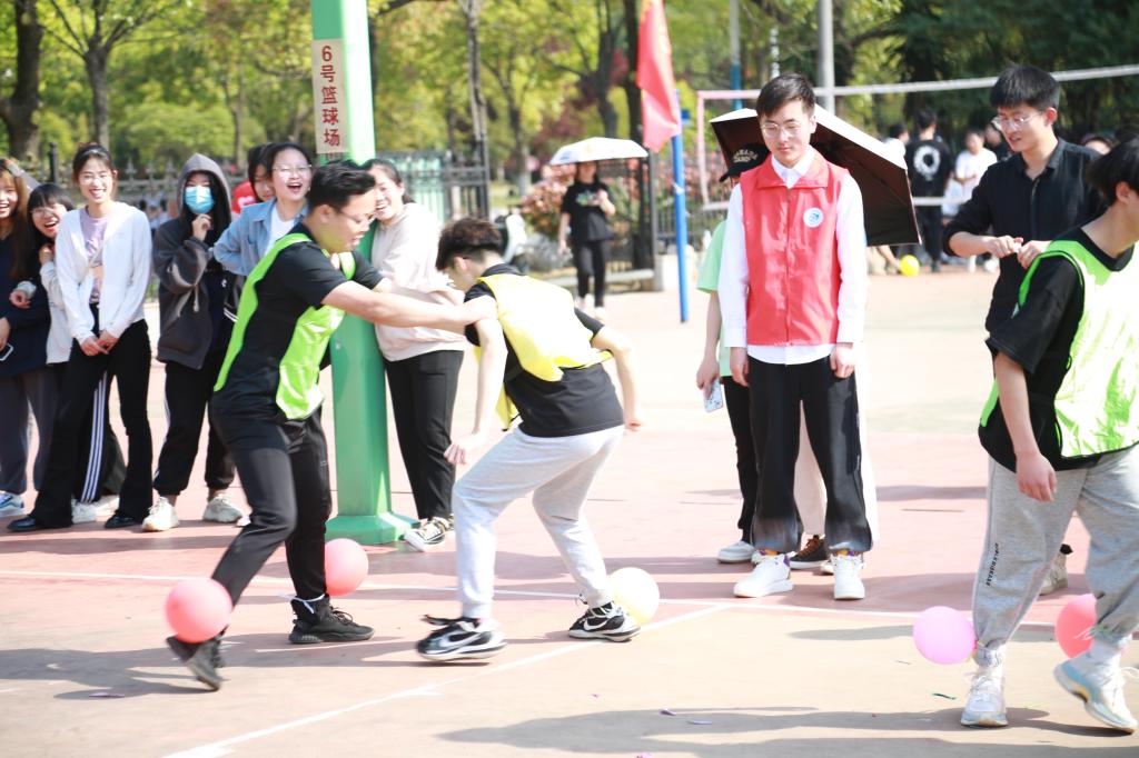周晓峰老师致开幕辞并宣布活动正式开始,各项比赛依次进行,在“踩气球”、“两人三足”等项目中,各参赛队员紧密配合,展现出顽强拼搏的意志和团结协作的能力。在拔河比赛中,各参赛队员奋力拼搏,团结一心,拉着一条绳,拧成一股劲,将现场活动氛围推到了高潮!