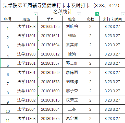 根据学校要求,2022年3月23日、3月27日(第五周)组织全体本科生进行每日“辅导猫”打卡。经分管辅导员、学工助理、班干部多次提醒,仍有11名同学未在规定时间内完成打卡,具体未打卡次数及日期如下:(表格显示)