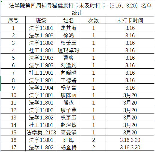 根据学校要求,2022年3月16日、3月20日(第四周)组织全体本科生进行每日“辅导猫”打卡。经分管辅导员、学工助理、班干部多次提醒,仍有17名同学未在规定时间内完成打卡,具体未打卡次数及日期如下:(表格显示)