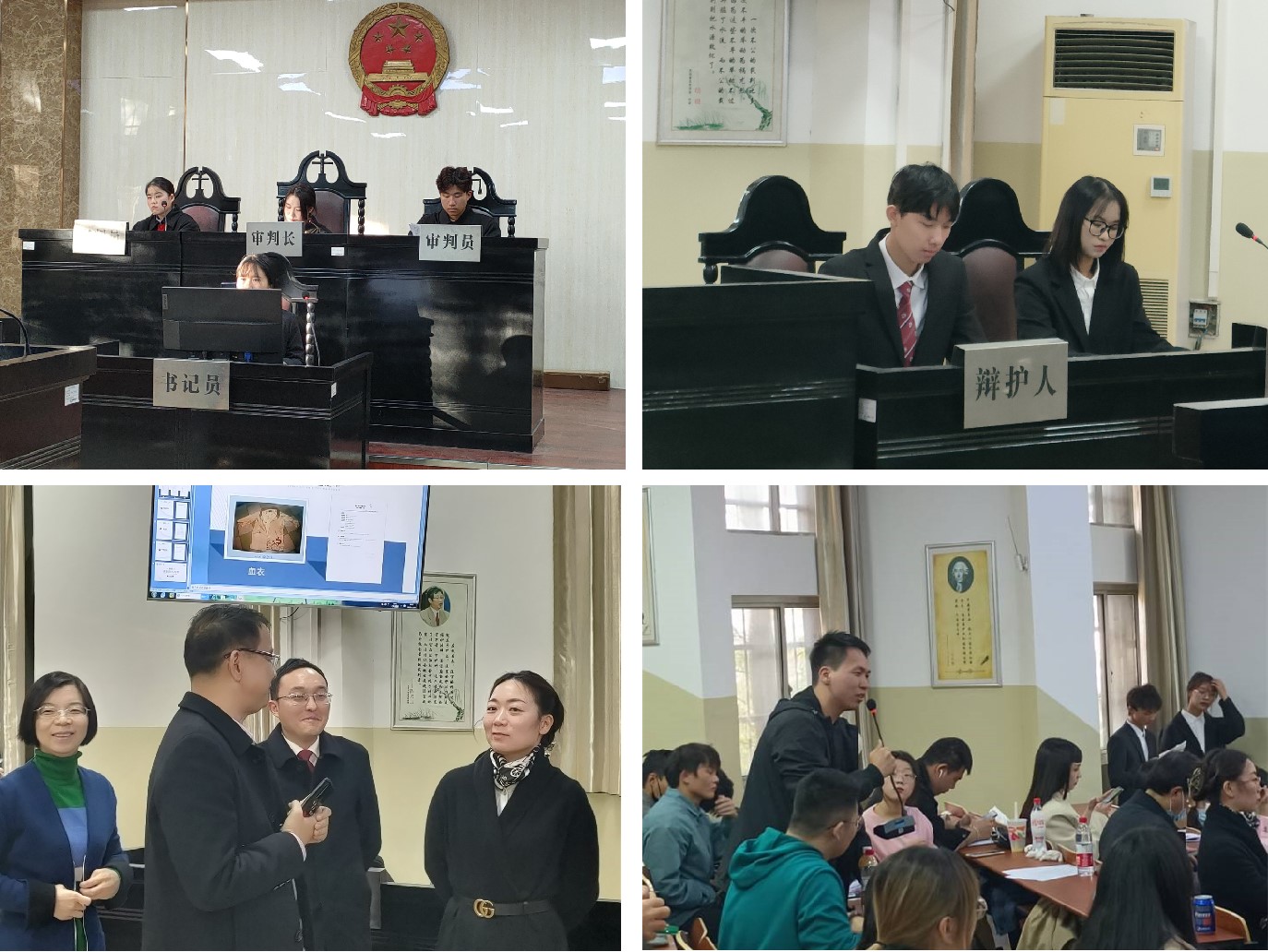 在本次模拟法庭中,庭审了“任翔故意伤害案”,“孙昊、严宇非法拘禁案”,“宋均雷、李敏故意伤害案”三起刑事案件,整个案件审理环节紧凑、逻辑严密、条例清晰。评委老师针对同学们的表现给出指导建议,彭泽君老师指出被告有为自己争取从轻量刑的权利,张星法官从法庭角度对同学们的模拟庭审提出建议,蔡敏律师指出身为辩护人的具体职责和职业素养。经由评委评分,法学12003班代表队获得本场第一名的成绩。在互动环节,同学们踊跃提问,老师们一一解答,现场气氛十分热烈。