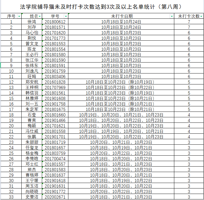 根据学校要求,2021年10月18日-10月24日(第八周)组织全体本科生进行每日“辅导猫”打卡。经分管辅导员、学工助理、班干部多次提醒,仍有33名同学未在规定时间内完成打卡,具体未打卡次数及日期如下:(表格显示)