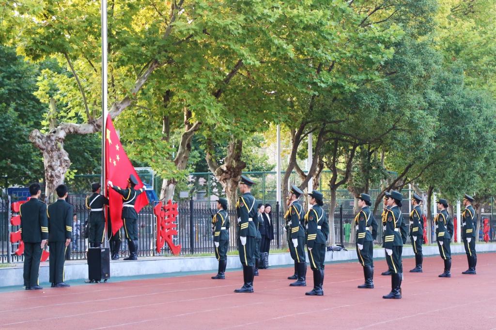 在升旗仪式上,五星红旗缓缓升起,全体师生在庄严的氛围中向国旗行注目礼,并齐唱国歌。