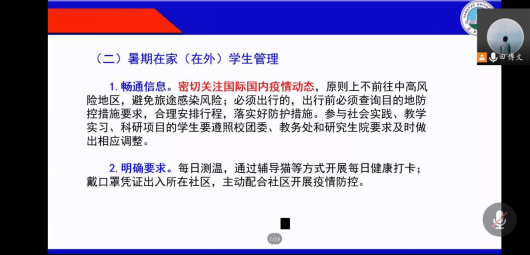紧接着,从暑期在校学生管理和暑期在家(在外)学生管理两方面重点强调了学生管理制度,要求同学们做到每日测温、通过辅导猫进行每日健康打卡、及时报告身体状况、密切关注国际国内疫情动态、非必要不外出、积极注射疫苗等要求,多次强调其必要性与重要性。