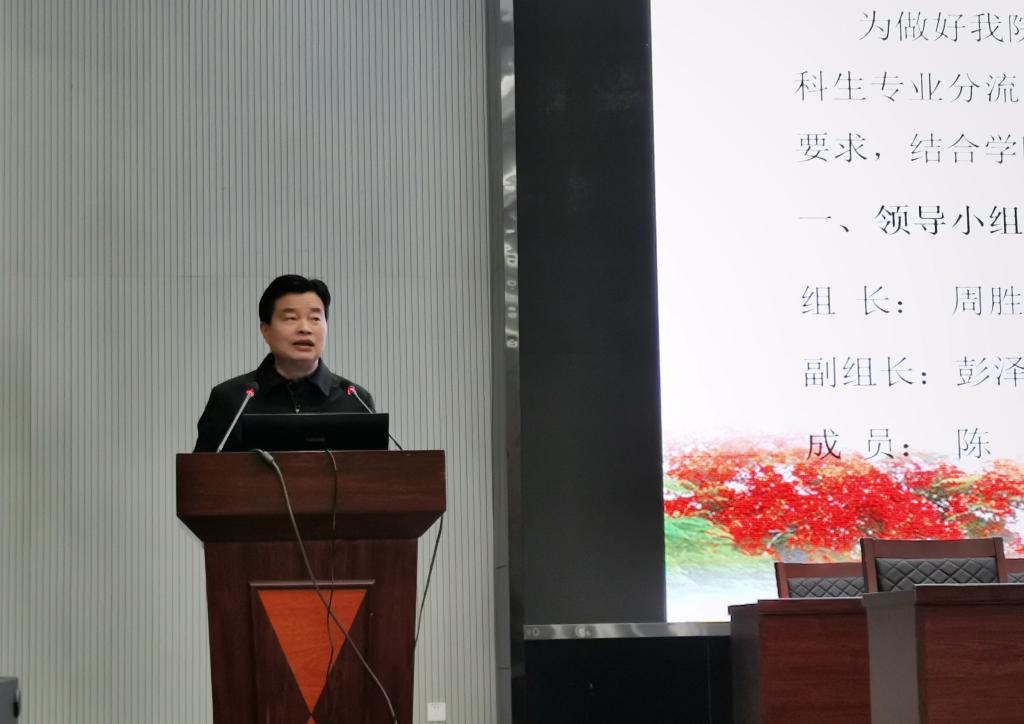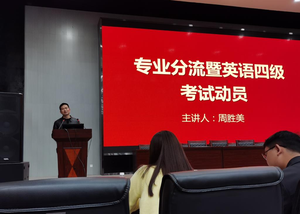 (通讯员 陈婉莹)4月17日晚7时,我院召开2020级专业分流暨英语四级考试动员大会,党委书记周胜美、院长李华成、副院长彭泽君、党委副书记胡红霞,班主任胡骑兵、邓从先、盛文军、周晓峰和全体2020级学生参加。