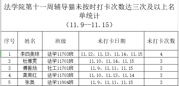 根据学校要求,2020年11月9日-11月15日组织全体本科生进行每日“辅导猫”打卡。经分管辅导员、学工助理、班干部多次提醒,仍有5名同学未在规定时间内完成打卡,具体未打卡次数及日期如下:(表格显示)