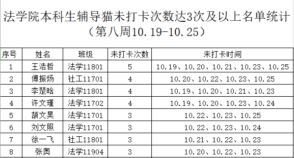 根据学校要求,2020年10月19日-10月25日组织全体本科生进行每日“辅导猫”打卡。经分管辅导员、学工助理、班干部多次提醒,仍有8名同学未在规定时间内完成打卡,具体未打卡次数及日期如下:(表格显示)