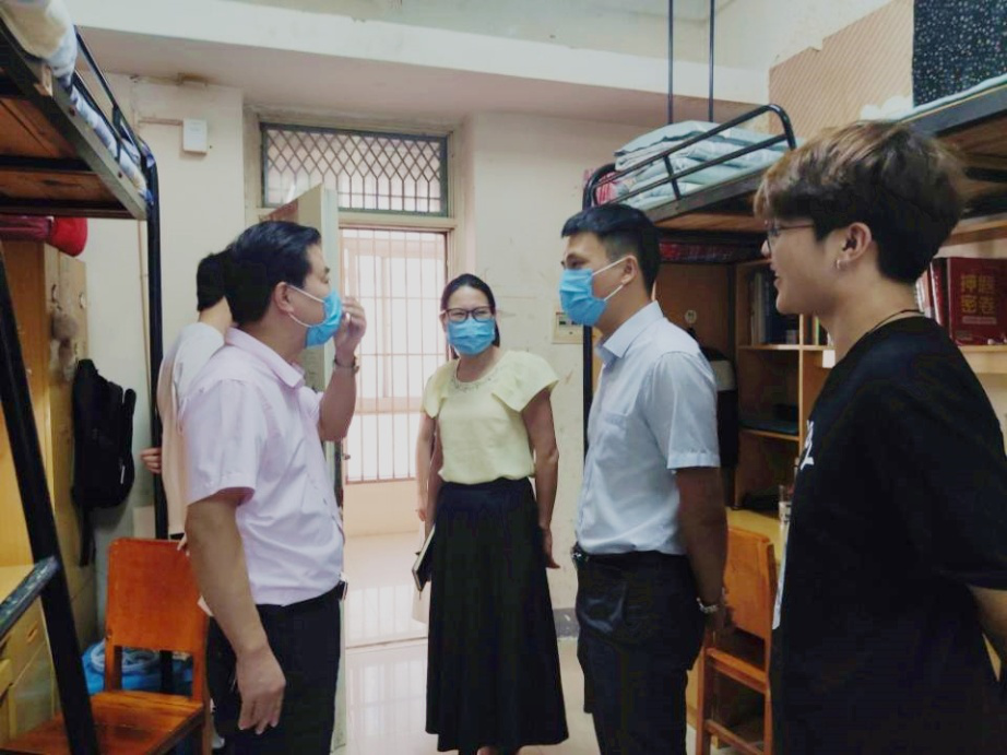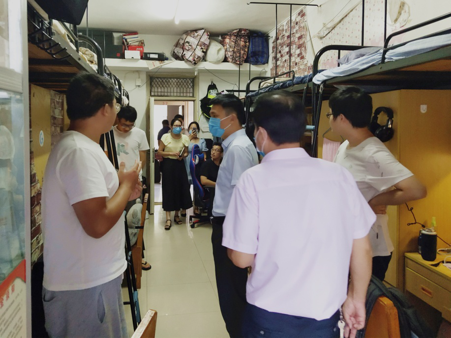 在检查过程中,学院领导和各位老师与同学们进行了亲切交流,关心同学们身体、思想、学习和生活等方面状况,重点叮嘱同学们:一是要严格遵守校园管控三阶段规定,坚持每天测量体温,异常情况要第一时间报告给辅导员;二是要注意宿舍卫生,要多通风、勤打扫,保持良好的宿舍环境;三是要注意个人健康与防护,出门必须佩戴口罩;要勤洗手,多消毒;要科学使用空调,谨防着凉。同时,老师们对大二学生的四级考试准备进度进行了详细了解,对一名大四学生的参军入伍进行了指导,还提醒同学们要好好准备上学期期末考试。同学们纷纷表示,阔别8个月,能够重返校园实属不易,今天能在宿舍与学院领导老师们交流,觉得特别亲切和温馨。