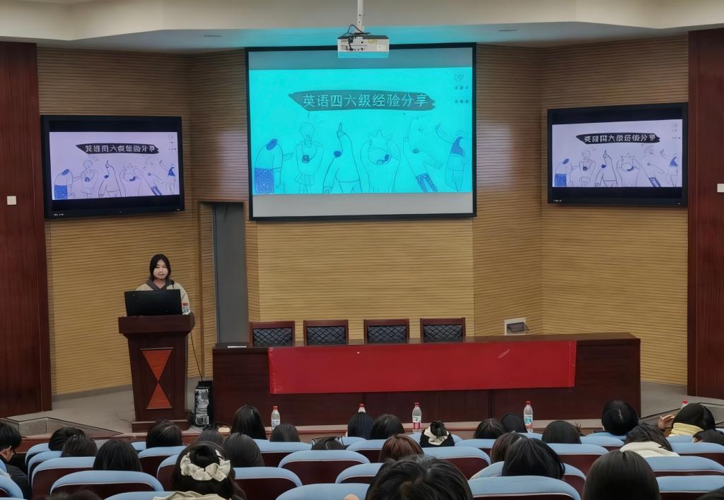 随后,英语四级经验分享环节温情启幕。2024 级陈佳林、吴思睿、郑淑玲、熊粤四位优秀学长学姐依次登台,结合自身备考实战经历,从词汇积累、听力训练、阅读理解答题技巧、写作翻译高分策略等核心维度,毫无保留地分享了科学制定备考计划、合理分配考试时间、调整应考心态等宝贵经验。学长学姐们的分享真诚恳切、贴合实际,为 2025 级同学明确了备考方向、提供了实操指引,现场不时响起自发的热烈掌声,氛围十分融洽。