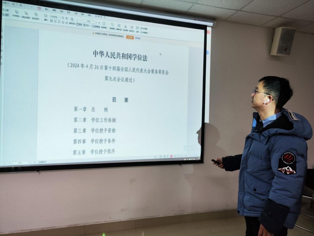 2025年1月4日,yl6809永利官网学位分委员会主席组织全体导师(含研究生导师和本科学业导师)开展集中学习研讨。会议重点学习了《学位法》中关于学位授予条件、学位授予程序、学位质量保障等方面的法律规定,特别是学生培养过程指导、学位论文质量把控等方面的内容。与会导师纷纷表示,将以《学位法》为指导,进一步强化责任意识,严格把关学位论文质量,确保学位授予的科学性和公正性。