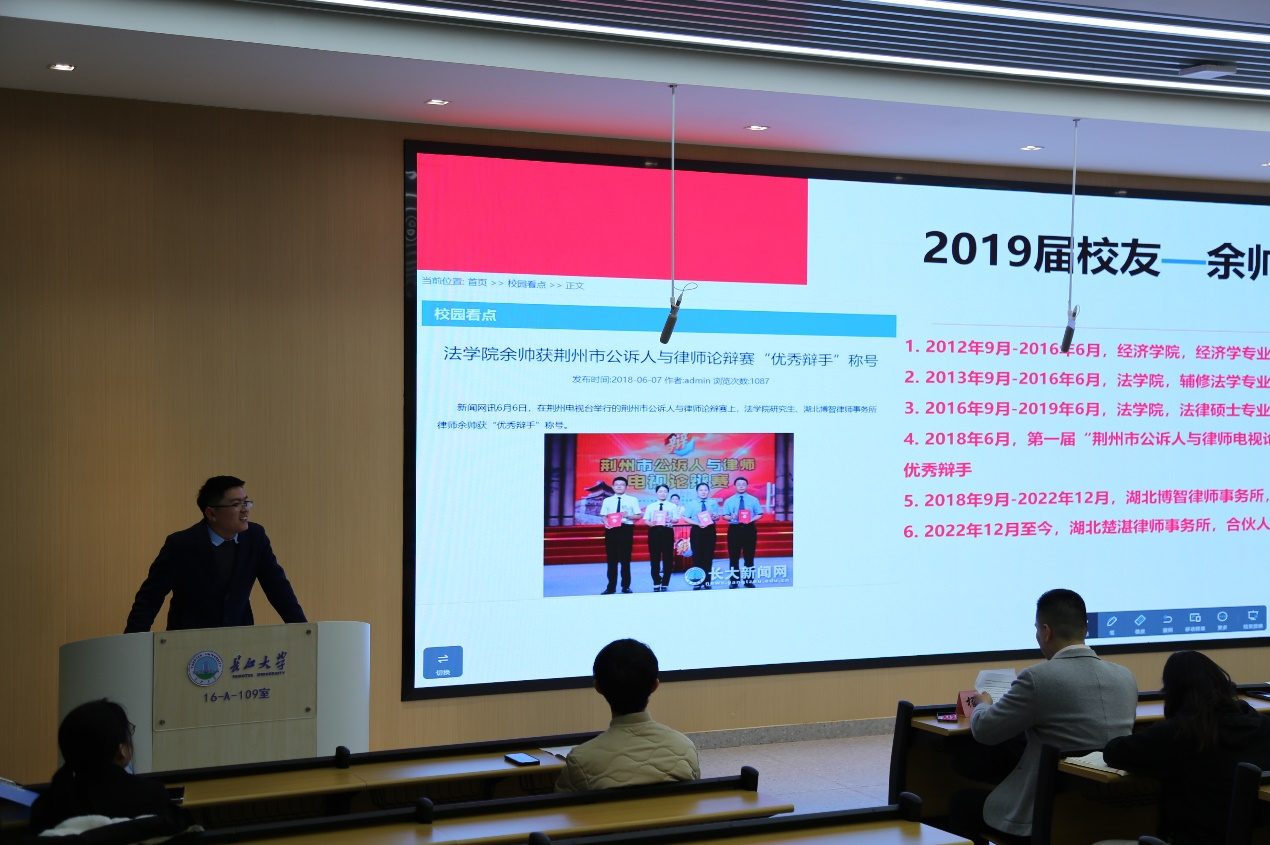 接着,曾经辅修法学专业的优秀校友——湖北楚湛律师事务所合伙人余帅律师,分享了他在yl6809永利官网辅修、深造、成长的心得体会。他的经验之谈,为新同学们提供了可资借鉴的范例和启示,点亮了求学之路,坚定了职业信心。