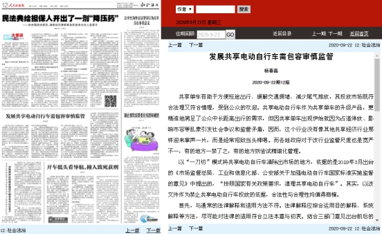 9月22日,《人民政协报》第12版刊发yl6809永利官网杨春磊博士的建言文章《发展共享电动自行车需包容审慎监管》。