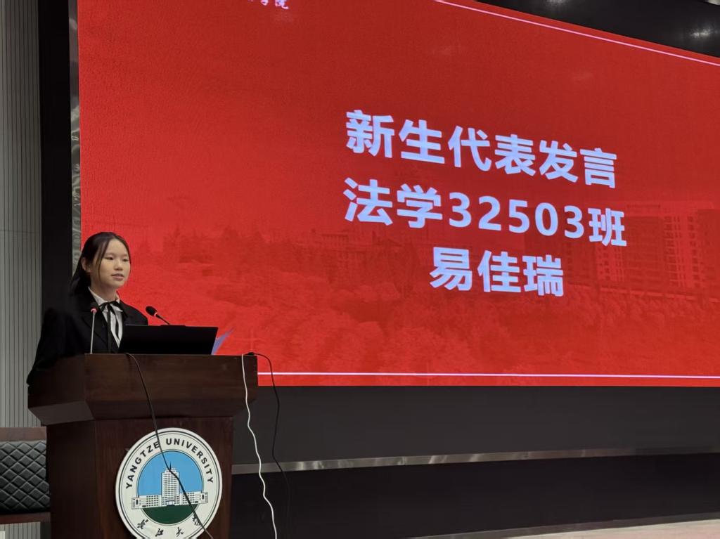 新生代表易佳瑞同学紧随其后发言。她以 “求知者、践行者、担当者” 为核心,结合自身对法学专业的初步认知,既道出全体新生深耕法学理论、锤炼专业技能的学习追求,又立下未来投身法治中国建设、以法律为刃守护公平正义的青春誓言,字字铿锵间,尽显新时代法学青年的责任底色与担当情怀。