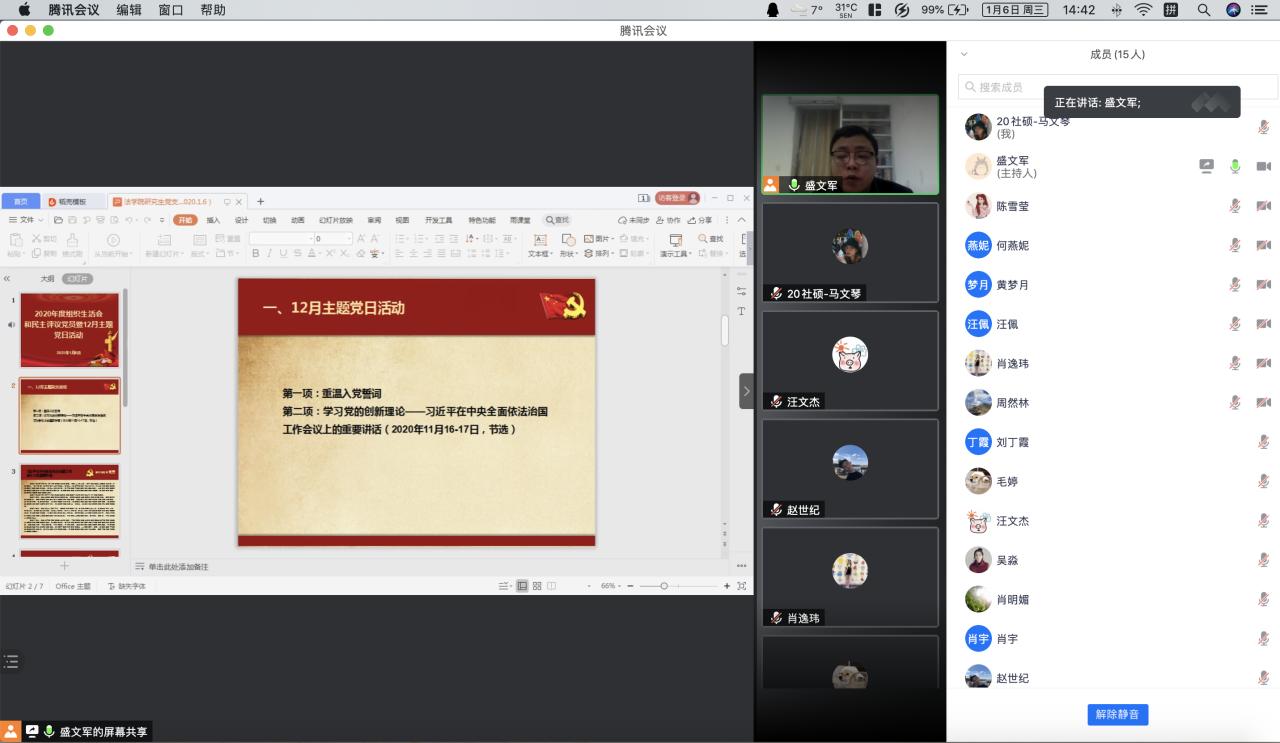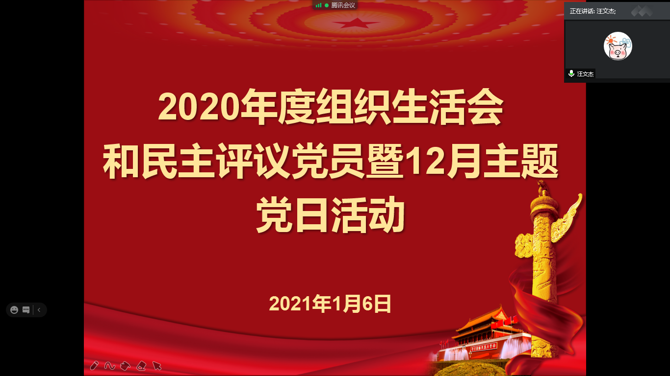 2021年1月6日14:30,yl6809永利官网研究生党支部通过腾讯会议开展了线上2020年度组织生活会和党员民主评议暨12月主题党日活动。会议由研究生党支部书记盛文军主持,全体研究生党员参加此次会议。