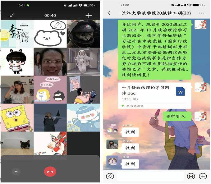 全体研究生同学积极参与班会活动,并对班会所讲内容进行了积极响应。在校同学线下聚集在一间教室里互相交流,非全日制不在校同学也通过腾讯会议等平台与在校同学一起进行了学习研讨。