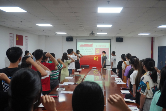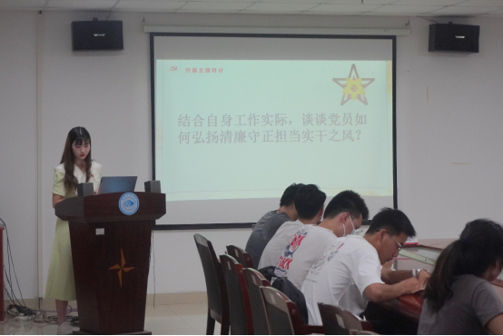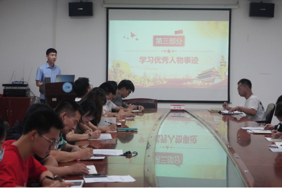 支部主题党日活动由研究生党支部副书记赵世纪主持,共分为六个议程:一是重温入党誓词;二是集体诵读党章;三是学习先进人物事迹;四是理论学习;五是主题研讨;六是党日活动总结。