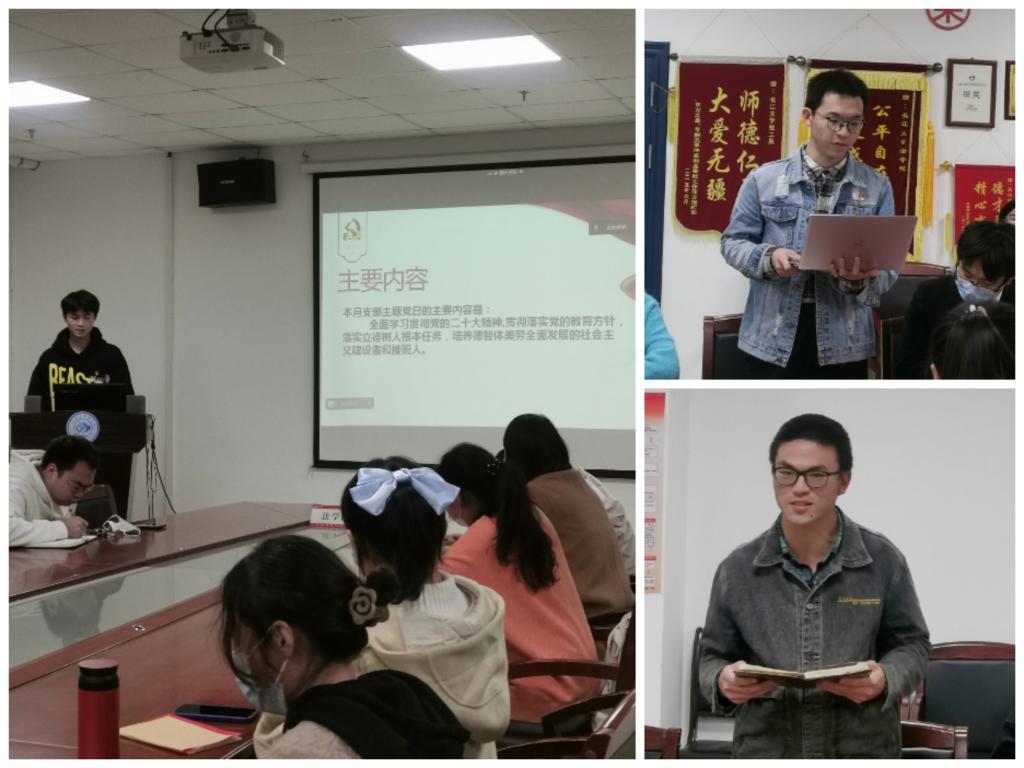 在中国共产党第二十次全国代表大会召开的背景下,主持人通过微党课的形式带领大家学习了什么是二十大、参加会议的人员、二十大的任务有哪些以及二十大的重要性等问题。主题研讨环节中,胡智豪同志以“历史是昨天的当下,当下是未来的历史”为引,表示大学生应立志做有理想、敢担当、能吃苦、肯奋斗的新时代好青年;张毅峰同志从自身层面出发,表示大学生应永跟党走;骆语杰同志讲到将学习成果转化为实践,做好老师与学生之间的桥梁。