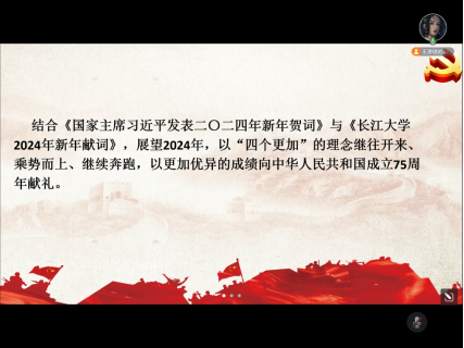 在主题研讨环节中,党员同志们结合自身实际,围绕《国家主席习近平发表二〇二四年新年贺词》与《长江大学2024年新年贺词》的精神,展望2024年,以“四个更加”的理念继往开来、乘势而上、继续奔跑,以更加优异的成绩向中华人民共和国成立75周年献礼为主题展开了热烈的讨论。周港同志首先进行了发言,他认为作为一名学生党员要以身作则带动身边同学一起学习,帮助身边有需要的同学,从小事做起,用自己的努力和优异的成绩向中华人民共和国成立75周年献礼。随后蒋小雨同志认为青年党员要更加坚定信念,提高鉴别能力,将个人理想与国家发展联系起来,在新的一年应以更加饱满的精神克服困难,无畏向前。