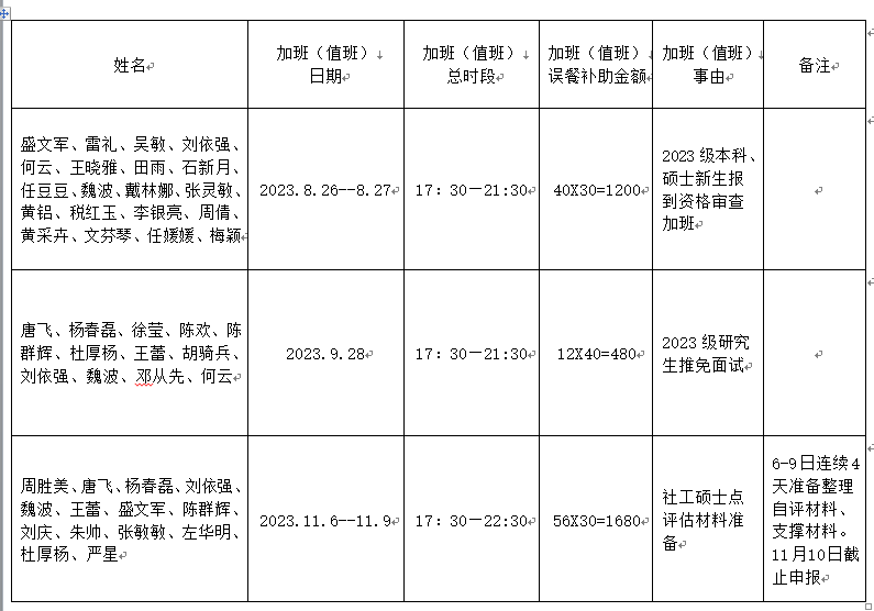 根据《长江大学加班(值班)误餐补助管理办法(试行)》(长大校发【2019】83号)文件规定,现对我院2023-2024学年第一学期加班(值班)误餐情况进行公示,如对加班(值班)误餐情况有异议,公示期为三天(11月23日-11月225日),请在公示期内向学院办公室(0716-8060329)反映。