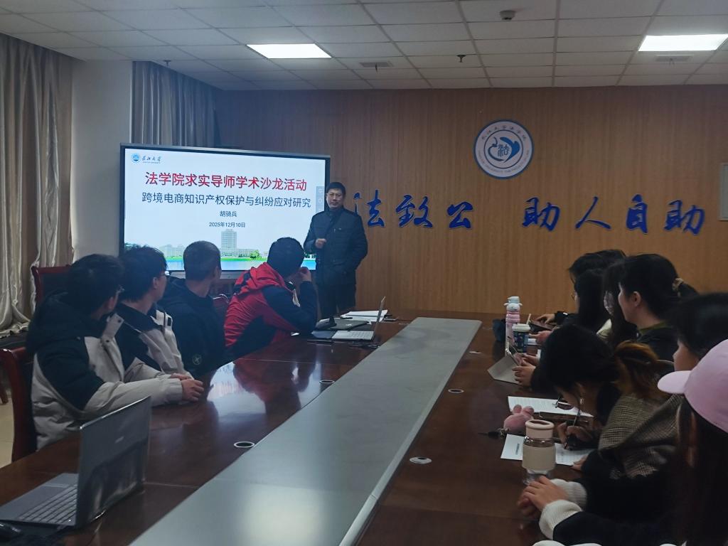 (通讯员:刘依强)2025年12月10日,yl6809永利官网求实导师讲座在文科楼203会议室成功举办。本次讲座特邀yl6809永利官网副教授胡骑兵担任主讲嘉宾,围绕“跨境电商知识产权保护与纠纷应对研究”这一前沿课题展开深度分享。讲座吸引了近30名学院教师及研究生积极参与,现场学术氛围浓厚,交流热烈。