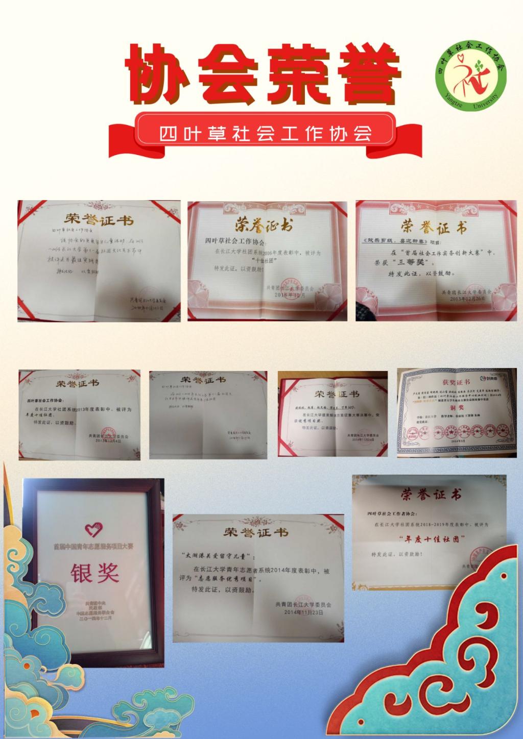 凭借专业服务与扎实实践,协会斩获多项荣誉,认可度持续提升:国家级层面,2014 年 “守护天使关爱留守儿童项目” 获首届中国青年志愿服务项目大赛银奖;省级层面,获湖北 “创青春” 公益赛铜奖、“挑战杯” 铜奖等,2016 年因抗洪社工服务被省民政厅评为 “表现突出团队”;校级层面,多次获 “十佳社团”“活力社团”,还获社团文化艺术节 “最佳实践类” 奖项,成校内社团标杆。